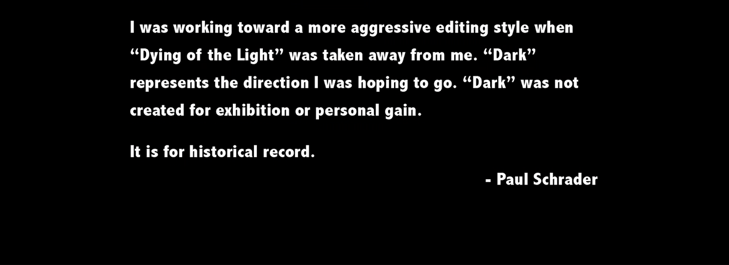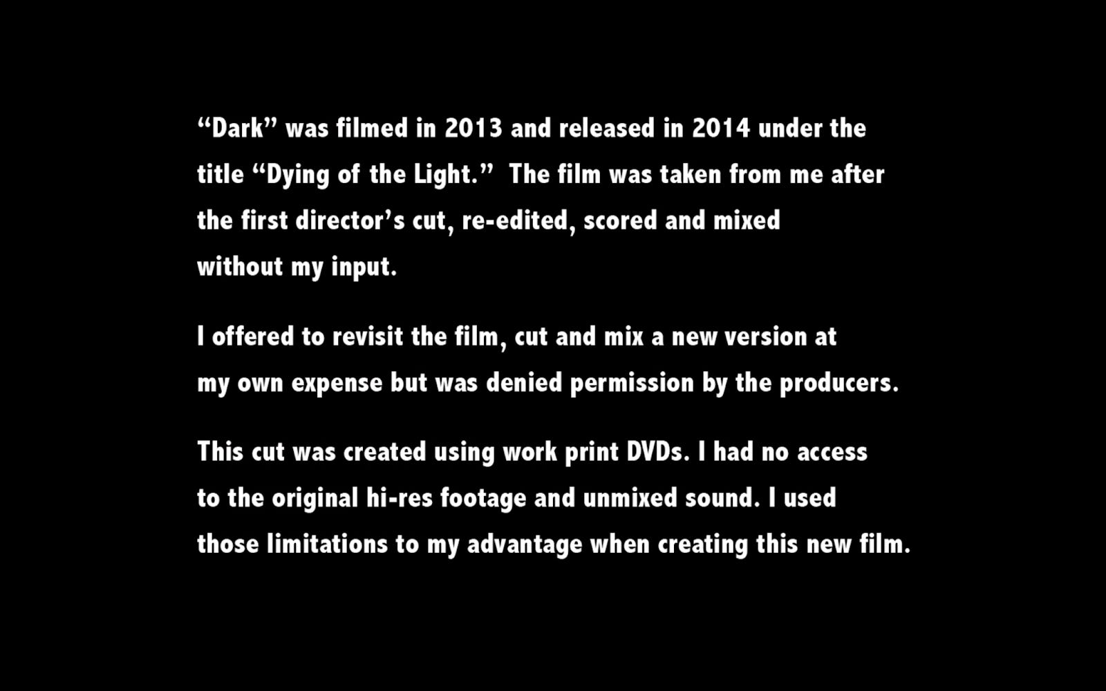 Paul Schrader, on the other hand, in Dark (2018), his director’s cut of Dying of the Light (2014), has fashioned an anti-film, by its very definition incomplete, in protest of the official release during which the project was taken away from him and re-edited, re-scored and mixed without his approval. Having publicly disowned the Lionsgate VOD release and been forbidden access to the work prints, Schrader used DVD copies and Final Cut Pro to cobble together an approximation of the film he would have liked to make instead (had he been given final cut instead of Final Cut). In a “title crawl” befitting an episode of Star Wars, Schrader explains the context of the Dark cut (Figure 1):